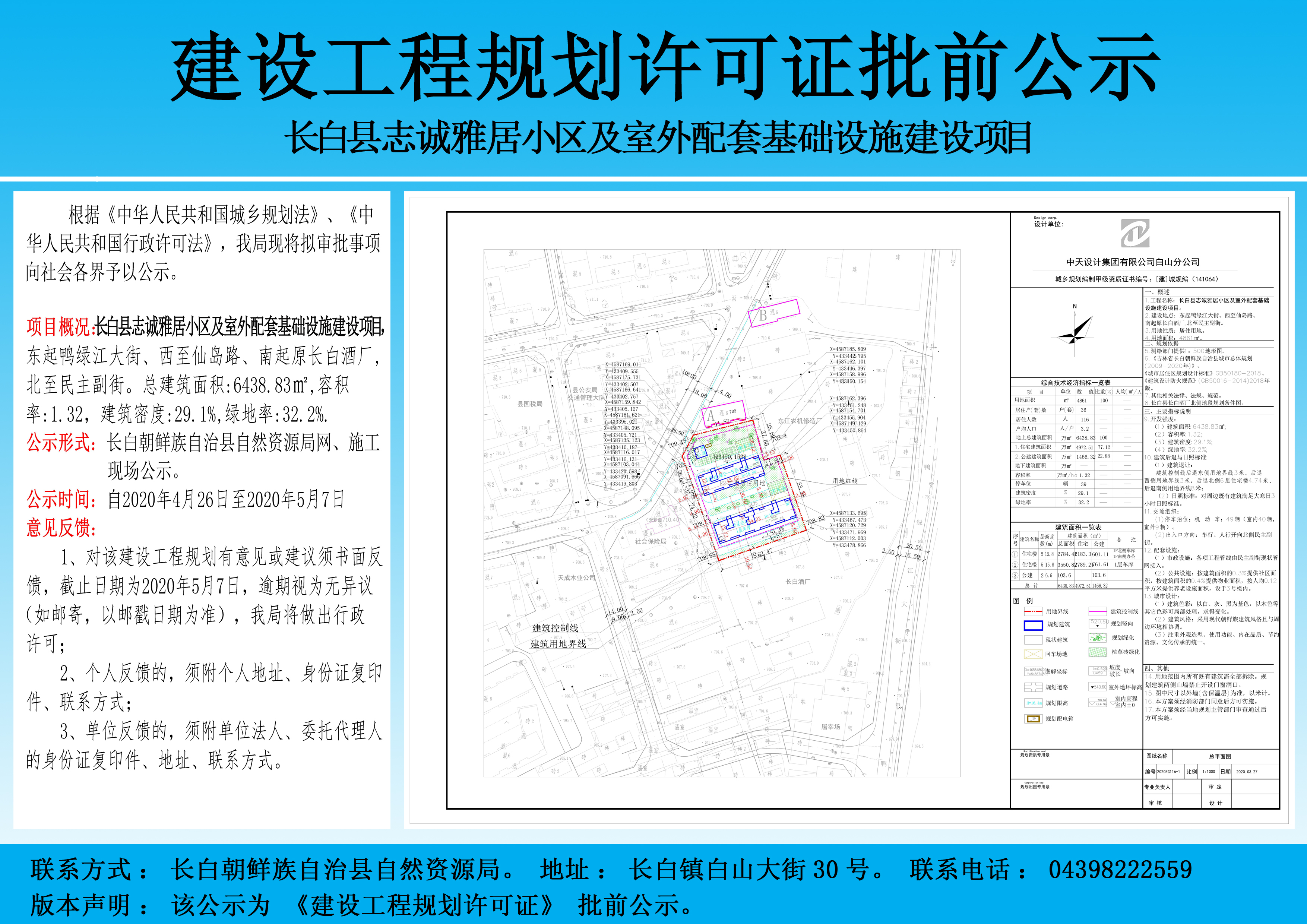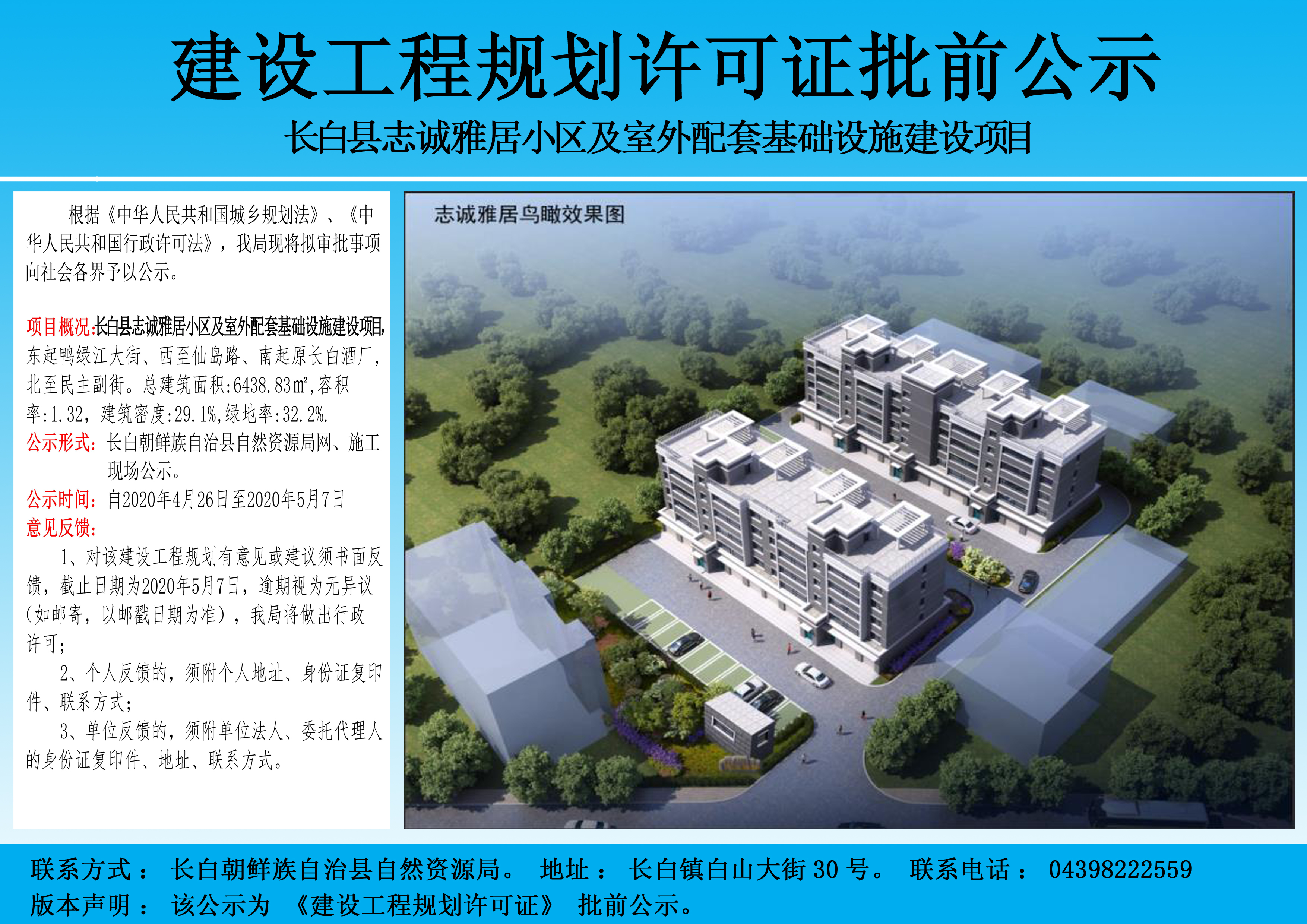 | 标 题: | 长白县志诚雅居小区及室外配套基础设施建设项目建设工程规划许可证批前公示 | ||